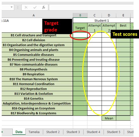 - Test scores (9-1) can be entered into the next two columns (shown with the yellow ring above). Each student can have two attempts at each test. The formulae in the spreadsheet will select the highest of these two scores to plot on the Radar Charts.