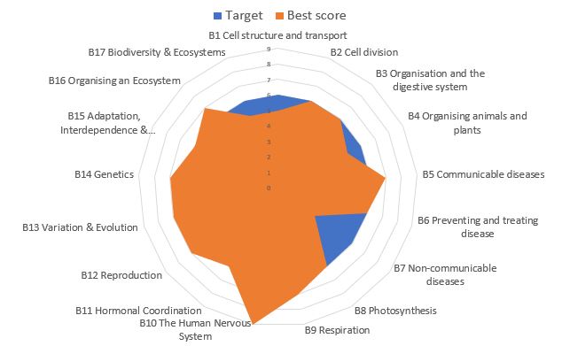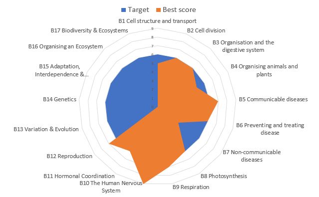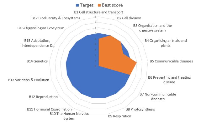 Over the next term she studies the first two GCSE Biology topics of B1 Cells and B2 Cell Division. After each topic she sits a published test along with the rest of her class which is marked, moderated and graded using published grade boundaries. She scored a grade 5 in the first topic and grade 6 in the second. These can be added to the chart as the first two orange spokes superimposed over the top of the blue Target spokes.